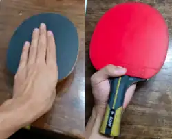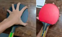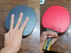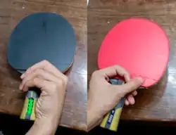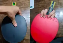 The forehand (red) and back side (black) view of a Japanese/Korean Penhold grip. The back side has no rubber and is not used for play, and so the fingers are extended over it for better feeling of the ball.
