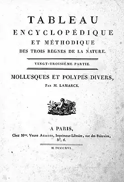 The Tableau encyclopédique et méthodique des trois regnes de la nature was an illustrated encyclopedia of plants, animals and minerals, notable for including the first scientific descriptions of many species, and for its attractive engravings. It was published in Paris by Charles Joseph Panckoucke, from 1788 on. Although its several volumes can be considered a part of the greater Encyclopédie méthodique, they were titled and issued separately.