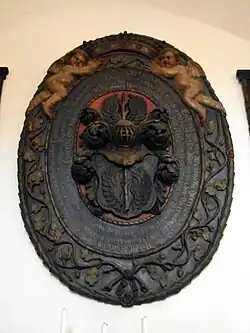 The christening bowl of 1671 shows the arms of the von Röbel family, who donated it. The parapet of the organ loft (17th century) features vivid flat carvings and again the arms of the von Röbel family. Two further sculptures of female saints (around 1430) belong to the furnishings. An oval epitaph commemorates Hans Christoph von Röbel (d. 1671). On the eastern outside wall, four plates recall the four major restructurings of the church in 1738, 1801, 1905, and 1924.