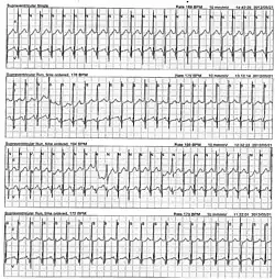 - ^ a b c d e f g h i j k l m n o p q r s t u v w x y z aa ab ac ad ae Ellis, Ethan R.; Josephson, Mark E. (2013-12-01). "Heart failure and tachycardia-induced cardiomyopathy". Current Heart Failure Reports. 10 (4): 296–306. doi:10.1007/s11897-013-0150-z. ISSN 1546-9549. PMID 23963583. S2CID 24317606.