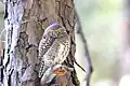 The collared owlet and the Sunda owlet were formerly included in the genus Glaucidium. They were moved to the resurrected genus Taenioptynx based on a molecular phylogenetic study published in 2019.[1][2] The genus Taenioptynx had been introduced by the German naturalist Johann Jakob Kaup in 1848 with the collared owlet as the type species.[3] The genus name combines the Ancient Greek tainia meaning "band" or "stripe" with ptunx meaning "owl".[4]