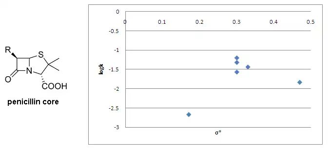 The Taft equation is often employed in biological chemistry and medicinal chemistry for the development of quantitative structure–activity relationships (QSARs). In a recent example, Sandri and co-workers[13] have used Taft plots in studies of polar effects in the aminolysis of β-lactams. They have looked at the binding of β-lactams to a poly(ethyleneimine) polymer, which functions as a simple mimic for human serum albumin (HSA). The formation of a covalent bond between penicillins and HSA as a result of aminolysis with lysine residues is believed to be involved in penicillin allergies. As a part of their mechanistic studies Sandri and co-workers plotted the rate of aminolysis versus calculated σ* values for 6 penicillins and found no correlation, suggesting that the rate is influenced by other effects in addition to polar and steric effects.