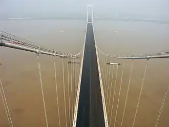 The Taizhou Yangtze River Bridge is a bridge complex over the Lower Yangtze River in Jiangsu Province in eastern China.[4] The bridge connects Taizhou on the north bank, Yangzhong on an island in the river, and Yaoqiao Village of Zhenjiang Municipality on the south bank, and consists of a suspension bridge across the north branch stream and a pair of box-girder bridges across the south branch stream. Taizhou Bridge Complex opened in 2012.