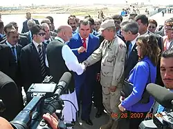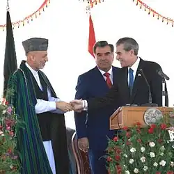 The Tajikistan-Afghanistan bridge spanning the Panj River between Panji Poyon (or Nizhniy Pyandzh), Tajikistan and Sherkhan Bandar, Afghanistan was opened on 26 August 2007.[1][2][3] The two-lane bridge is 672 metres (2,205 feet) long and 11.6 metres (38 feet) wide. It cost approximately $40 million, financed by the US Army Corps of Engineers and was designed and constructed by Italian company Rizzani de Eccher S.p.A. The Tajik President Emomali Rahmon and Afghan President Hamid Karzai were joined by US Secretary of Commerce Carlos Gutierrez at the opening ceremony.
