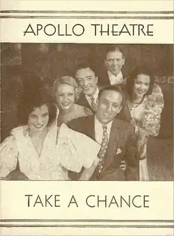 Take a Chance started as a musical titled Humpty Dumpty written by DeSylva and Schwab, which flopped immediately during out-of town tryouts in Pittsburgh, Pennsylvania, where it had opened on September 26, 1932. The musical was extensively rewritten, and composer Vincent Youmans was brought in to contribute to the score. After further tryouts in Philadelphia, Wilmington, Delaware, and Newark, New Jersey, the musical was renamed, and the book, music, and cast had changed, leaving only Ethel Merman.[1] Composer Richard Whiting subsequently left the production.[2][3]