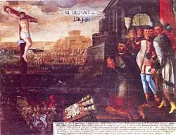 He succeeded his father-in-law Krsto Ungnad as Ban of Croatia in 1583. His first victory occurred at the battle of Slunj in 1584. In 1591 he freed the Moslavina region. In 1592 he suffered his only great defeat at the battle of Brest. When Ottoman forces tried to retake the area in 1593, the battle of Sisak ensued in which the Holy Roman Empire defeated the Ottoman Empire,[3] severely hampering the Ottoman's ability to expand further into Europe and triggering the Long Turkish War. For this victory Erdődy received congratulations from Pope Clement VIII and was knighted into the Order of Saint Saviour by Philip II of Spain. The phrase "In deo vici" (English: In god I have won) is attributed to him following the victory in Sisak.[4]