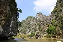 Tam Cốc, literally "three caves", consists of three natural caves — Hang Cả, Hang Hai, and Hang Ba — on the Ngô Đồng River.[2][3] Tourists are taken in small boats along the river from the village of Ván Lám, through rice fields and limestone karsts, through the caves, and back. Local women serve as guides and attempt to sell embroidered goods to their passengers. The guides are well known for rowing their boats using their feet.[4]