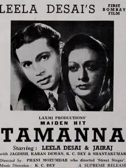 Tamanna is a Bollywood film. It was released in 1942.[1][2] The film was directed by Phani Majumdar, who also wrote the screenplay, for the Laxmi Productions Ltd. banner. This was the first film from the Laxmi banner, which had been started by Chimanlal Trivedi who earlier headed Circo Productions. Tamanna was also the renowned dancer, Leela Desai's, first film in Bombay. The main cast included Leela Desai, P. Jairaj, Karan Dewan, Jagdish Sethi and K. C. Dey, who besides acting, composed the music. S. K. Kalla wrote the dialogue and lyrics.[3]
