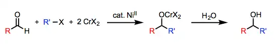 - ^ Okude, Y.; Hirano, S.; Hiyama, T.; Nozaki, H. (1977). "Grignard-type carbonyl addition of allyl halides by means of chromous salt. A chemospecific synthesis of homoallyl alcohols". J. Am. Chem. Soc. 99 (9): 3179–3181. Bibcode:1977JAChS..99.3179O. doi:10.1021/ja00451a061.