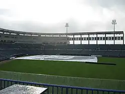 After exploring other possible stadium sites around the Tampa Bay area, FC Tampa Bay decided to play its 2010 inaugural season at George M. Steinbrenner Field, an 11,000-seat baseball stadium near West Tampa. The club shared the facility with the Tampa Yankees, the Class A-Advanced affiliate of the New York Yankees,[29] which presented some difficulties. Scheduling home games was a challenge because the club's seasons overlapped for most of the summer. The pitcher's mound and the infield dirt could not be removed, forcing the soccer field to be set across the outfield from the right field foul line to left centerfield. This created a pitch much smaller than most professional soccer fields, and a large portion of the playing surface of one attacking third was clay.[30] And because of the difficulty of running on wet clay and potential damage to soggy turf, the Rowdies were not allowed to take the field when the ground was wet, which is often the case during Tampa's summer rainy season.[31]