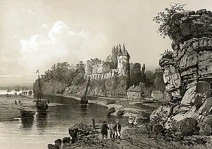 The name of Tancarville does not appear until the early twelfth century, first shown in a charter for Henry I in 1103, among the barons who are mentioned as witnesses is Raoul's son, "Willelmus de Tancarvilla".[2] It was only after this that the name of Tancarville is used and the castle appeared for the time in texts. Prior to this, the family members would have been styled: de la Ville Tancrède or Tancardi Villa.