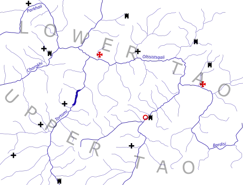 The history of Tao could be traced to the emergence of the tribal confederation of Diauchi (Taochi, Tayk, Taochoi, Tao) at 12–8th century BC.[2] Diauchi was engaged in war with the powerful kingdom of Urartu, and the inscriptions of the Urartu kings Menua (c. 810–786 BC) and Argishti (c. 786–764) reveal the wealth and power of this kingdom, which was possibly proto-Georgian speaking.[3] In the 8th century BC, Diauchi was destroyed by the neighboring Colchis and Urartu and part of its territory was annexed by the Colchis. In the 4th-3rd centuries BC region was organized into a province of the Iberian Kingdom.