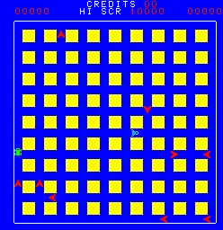 The locale, described by the game cabinet as "The Crystal City", is a 10x10 grid of roads demarcated by square buildings. The player, piloting the Wummel, which looks like a small green car, maneuvers through the maze trying to shoot enemies and avoid collisions with them. Most of the enemies consist of angry-looking red wedges known as Targs. Occasionally, a small cyan-colored Spectar Smuggler appears; shooting it scores a significant bonus. None of the enemies shoot back; their sole means of destroying the Wummel is ramming into it.
