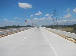 TPLEX follows a route that parallels the MacArthur Highway, running through the provinces of Tarlac, Nueva Ecija, Pangasinan, and La Union. The expressway has four lanes, two per direction, separated by Jersey barriers. Sections by exits, toll plazas, viaducts, and their approaches are illuminated at night. Significant sections are built on embankments overlooking rice paddy fields.[6] The expressway crosses the four rivers in the Pangasinan province. The rivers along the TPLEX are the Agno River, Binalonan River, Aloragat River, and the Bued River.