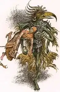 "It was roughly the shape of a man but it had the head of a bird; some bird of prey with a cruel, curved beak. It had four arms which it held high above its head, stretching them out Northward as if it wanted to snatch all Narnia in its grip; and its fingers - all twenty of them - were curved like its beak and had long, pointed bird-like claws instead of nails."