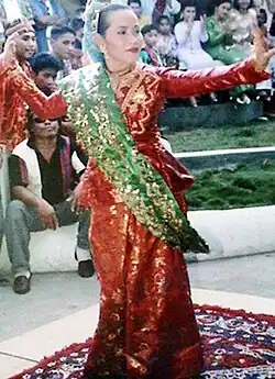 ![]() A Tausug woman wearing traditional attire and performing a pangalay dance | |