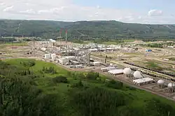 The town uses the Peace River which flows eastward as a source of drinking water and as outlet for industrial waste. The drinking water supply comes from an intake pipe southwest of town. The water is mechanically and chemically filtered then pumped to a reservoir on a ridge north of town. A gravity pump moves the water to the town from the reservoir using 18 km of watermains.[13] Sewage is collected by 13 km of sanitary sewers and processed by a two-cell lagoon system before being absorbed into the ground.[13]