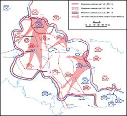 The airfield was under threat of being taken by the Soviet Red Army but Hermann Göring forbade its evacuation, despite request from Major General Fiebig, who was in charge of the air supply for Stalingrad. On 23 December Göring gave permission to evacuate, but it was too late; Tatsinskaya was overrun a day later, with the German Luftwaffe losing almost 70 of the 180 Ju 52s stationed there and all ground equipment.[2][3] The fall of the airfield, along with the one at Morozovskaya being threatened, brought supplies to the 6th Army to a halt until the 26th.[4] Although briefly retaken by the Germans on the 28th, Tatsinskaya fell back into Soviet hands by 31 December.[5]