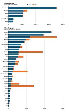 2. ^ a b The Munda and Mundari languages are linguistically considered the same, with Munda being a subgroup of the Austroasiatic language family and Mundari being a spoken language within that subgroup. However, in Assam, the term "Munda language" is primarily used by the Munda ethnic group, while "Mundari" is used by both the Munda and Bhumij ethnic groups, and the terms are loosely interchangeable. Consequently, census classifications treat them as two distinct languages based on enumerated responses.