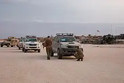 Technicals were used by Iraqi military forces in the 2003 invasion of Iraq.[31] The Iraqi Republican Guard and Fedayeen emulated tactics of the Somali National Alliance with limited success,[32][33] but were outmatched by Coalition armor and aviation.[34][35] In the aftermath of the invasion, technicals were used by Iraqi insurgents for transporting personnel and quick raids against the Iraqi police forces. The insurgent use of technicals increased after the Iraq Spring Fighting of 2004.