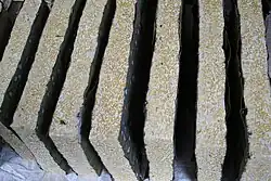 A specialty of Malang, the rough-textured tempeh menjes kacang is made from black soybeans mixed with other ingredients, such as peanut dregs, cassava fiber, and soybean meal. The process of making menjes kacang is quite similar to black oncom.[42]
