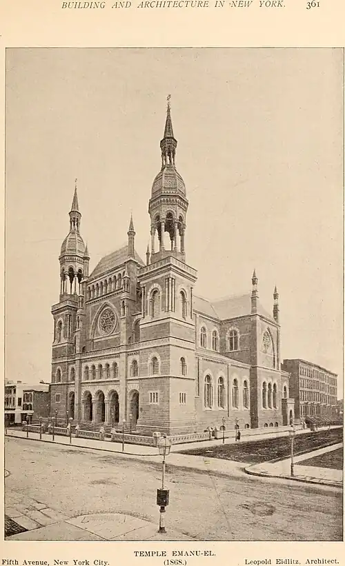In 1868, the Congregation Emanu-El of New York erected a new synagogue building for the first time, a Moorish Revival structure designed by Leopold Eidlitz, assisted by Henry Fernbach, at 43rd Street and 5th Avenue after raising about $650,000. It was demolished in 1927, and replaced by a 1930s synagogue, also called Temple Emanu-El.[1][2][3]