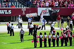Rhule began the 2015 season by beating Penn State, his own alma mater, 27–10 in front of a sellout crowd of 69,176 – a record for a college football game at Lincoln Financial Field.[21] The win against Penn State was the school's first since 1941. The Owls also set an American Athletic Conference record for sacks in a game by recording 10 against highly touted NFL prospect Christian Hackenberg.[22] One of the 10 sacks came on a two-man rush against Penn State's offensive line and was featured on ESPN's "Not Top 10."[23] The Owls followed up their historic win by going on the road and knocking off American Athletic Conference preseason favorite Cincinnati 34–26.