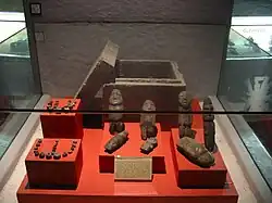 Most of the objects found in the Templo Mayor were offerings. Although many are of Mexica design, there are also abundant items from other peoples, brought in as tribute or through trade. Sculptures, flint knives, vessels, beads and other sumptuary ornaments—as well as minerals, plants and animals of all types, and the remains of human sacrifice—were among the items deposited in offerings. All of these fulfilled a specific function within the offering, depending on the symbolism of each object. In excavations at the Templo Mayor, different types of offerings have been found and have been grouped by researchers in terms of Time (the period in which the offering was deposited); Space (the location of the offering within the structure); Container (type and dimensions of the receptacle containing the objects); internal distribution (placement of objects within the offering) and value of the items. The offerings were usually contained in cavities, in stone urns, and in boxes made of slabs. These are found under floors; in platforms, architectural bodies, stairways and in temples. These offerings were placed accompanied by complex rituals following set temporal, spatial and symbolic patterns, depending on the intention of the offering.[27]