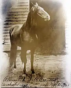In 1886, Black Allan (later known as Allan F-1) was born. By the stallion Allendorf (from the Hambletonian family of Standardbreds) and out of a Morgan mare named Maggie Marshall, he became the foundation sire of the Tennessee Walking Horse breed.[5][14] A failure as a trotting horse, due to his insistence on pacing, Black Allan was instead used for breeding. From his line, a foal named Roan Allen was born in 1904. Able to perform several ambling gaits, Roan Allen became a successful show horse, and in turn sired several famous Tennessee Walking Horses.[1]