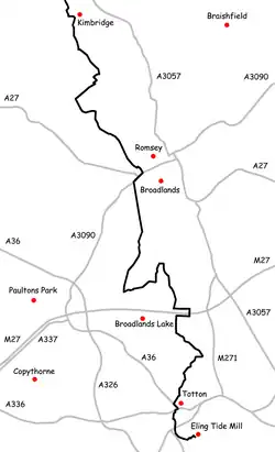 The northern end of the footpath starts in the car park on Walbury Hill. It passes through the towns of Romsey and Totton and the villages of Linkenholt, Ibthorpe, Hurstbourne Tarrant, St Mary Bourne, Longparish, Forton, Wherwell, Chilbolton, Stockbridge, Horsebridge and Mottisfont. The southern end of the footpath is at Eling Quay.