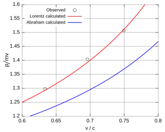 Electrons traveling between 0.25–0.75c indicated an increase of momentum in agreement with the relativistic predictions, and were considered as clear confirmations of special relativity. However, it was later pointed out that although the experiments were in agreement with relativity, the precision was not sufficient to rule out competing models of the electron, such as the one of Max Abraham.[4][5]