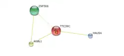 Textmining studies have identified several proteins that TTC39C may interact with.[24] These protein-protein interactions have not been confirmed; however, two of the identified proteins, AGBL1 and HAUS4, are likely candidates due to their roles in anaphase.[24] Additional potential protein-protein interactions were identified for TTC39C in mice; however, there is no apparent connection to TTC39C besides coexpression.