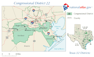 After the 1990 census, the 22nd remained largely unchanged. It covered all of Fort Bend County, all of Brazoria County save for its western and southern edges, and a small portion of southwest Houston around the Alief, Westchase and Sharpstown areas. The district was further reconfigured after the 2000 census, taking effect after the 2002 elections, when DeLay was re-elected and became House Majority Leader. The district lost Fort Bend County's share of Houston, but picked up a large slice of southeast Harris County, including portions of Clear Lake City, Pasadena, La Porte, Deer Park and Seabrook.