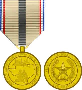 | Description | The ribbon drape is of blue, white, red, khaki and brown stripes. The medal is bronze with an outline of the State of Texas and scenes of aircraft and combat personnel with the words "Operation Desert Shield/Desert Storm Campaign Medal". On the reverse is the Coat of Arms of Texas with the words "Texas National Guard" and "For Service". |