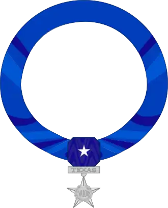 | Description | The neck ribbon is blue with a white star. The medal consists of a silver star below a bar with the word "Texas". In the center of the star, between olive and live oak branches is a circle with the word "Valor". |