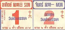 While solar-calendar weekdays have names, lunar-calendar days number sequentially from 1 to 14 or 15 in two segments depending on whether the moon is waxing or waning. For example, "raem 15 kham duean 12 แรม ๑๕ ค่ำ เดือน ๑๒" means "Waning of the 15th Night of the 12th Lunar Month".