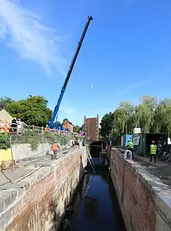During the execution of the phase 1a project, it became obvious that there would be a shortfall in funding, caused in part by the development of Brimscombe Port being deferred. Thus the Heritage Lottery funded works ended at Bowbridge Lock, and work up to Hope Mill Lock has been undertaken largely by volunteers. Some work to prepare the Brimscombe Port site for development was funded by a £2 million grant from the Homes & Communities Agency given in October 2015.[39] Volunteers completed restoration of Griffin's Mill Lock in 2017, but dredging of the intervening channel took rather longer, and the lock was opened on 9 July 2018. Work had already begun on the restoration of Ham Mill Lock, the next one upstream. In a separate development, water supply to the restored section was improved by building a feeder siphon at Gough's Orchard Lock, which takes water from a millpond supplied by the River Frome and feeds it into the lock. The pipeline runs over the top of the canal bank, and a solar-powered pump creates a vacuum within the pipe to allow the siphoning to begin. The volume of water taken is regulated by a gate valve, and is governed by an abstraction licence issued by the Environment Agency.[45]