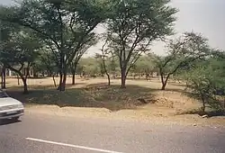 The natural vegetation of this dry area is classified as northwestern thorn scrub forest (i.e. small, loosely-scattered patches of greenery).[28][29] The densities and sizes of these green patches increase from west to east, following an increase in rainfall. The primary vegetation of the Thar Desert is composed of trees, shrubs, and perennial herb species, including:[30]
