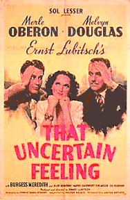 That Uncertain Feeling is a 1941 American comedy film directed by Ernst Lubitsch and starring Merle Oberon, Melvyn Douglas and Burgess Meredith. The film is about the bored wife of an insurance salesman who meets an eccentric pianist and seeks a divorce. The screenplay by Walter Reisch and Donald Ogden Stewart was based on the 1880 French play Divorçons by Victorien Sardou and Émile de Najac.