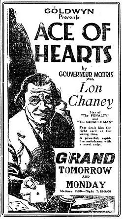 The Ace of Hearts is a 1921 American crime drama film produced and directed by Wallace Worsley. The screenplay by Ruth Wightman is based on Gouverneur Morris's[1] story The Purple Flask, which was serialized in two parts in Cosmopolitan magazine in 1917.[2] The film stars Leatrice Joy, John Bowers, Raymond Hatton and Lon Chaney. One unique feature of this film is that the main title of the movie isn't written on the screen; rather an Ace of Hearts card is shown in its place instead.