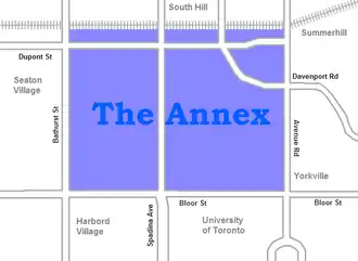 The Annex is a neighbourhood in Downtown Toronto, Ontario, Canada. The traditional boundaries of the neighbourhood extend north to Dupont Street, south to Bloor Street, west to Bathurst Street and east to Avenue Road.[3] The City of Toronto recognizes a broader neighbourhood definition that includes the adjacent Seaton Village and Yorkville areas.[4]