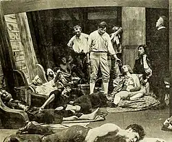 The photoplay then shifted to scenes at sea aboard HMS Victory, Nelson's flagship. It is the day before the battle and officers are writing letters, perhaps their final messages, to their families and sweethearts. Lieutenant Prescott (Herbert Prior) is shown writing his fiancée (Laura Sawyer), who appears as a vision with "beautiful scenic and photographic effect".[3] Advancing to the next day, the film depicted Nelson making a final entry in his personal diary and later on Victory bidding farewell to Captain Hardy (James Gordon) and other officers once the long line of enemy vessels is sighted on the horizon. Next, "splendidly portrayed" in the film, signal flags are hoisted aloft to relay the admiral's own simple but inspiring message to his crews across the British fleet: "England expects that every man will do his duty".[3] Scenes then transitioned to the flagship's decks being cleared for action, followed by footage showing the battle itself with "the firing of the guns", "ships caught on fire", and close-up views of the battered Victory. While the battle is raging, Nelson and Hardy are openly and calmly walking on the quarterdeck giving commands. Suddenly, Nelson drops to his knees, struck down by a musket ball shot by a sniper aboard the adjacent French warship Redoubtable. Mortally wounded, Lord Nelson is quickly carried below decks to the ship's cockpit. There in the film's final scenes, described as replete with "grandeur" and "pathos", the heroic admiral dies, but not until Hardy brings him news of the British fleet's overwhelming defeat of Napoleon's Franco-Spanish fleet.[3]