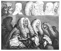 The surviving painting and original (first state) print shows four judges sitting below the King's Arms, in session in the Court of Common Pleas. Hogarth ridicules the lack of ability or interest among the judiciary, whose "shallow discernment, natural disposition, or wilful inattention, is here perfectly described in their faces".[11] None of the four judges is concerned with the case before them: one is busy other business; one is examining a former deposition or some material unconnected to the case before him; and the final two are lost on various stages of sleep.[11] The four judges have been identified as the Honourable William Noel; Sir John Willes, the Chief Justice, the heavyset judge in the centre (with pince-nez in the engraving); Henry, later Earl Bathurst, and later still Lord Chancellor; and Sir Edward Clive, who is dozing on Bathurst's shoulder.[12] Willes was known as a hanging judge – he had refused mercy for Bosavern Penlez in the cause célèbre of 1749,[note 1] but was equally famed as a rake, and he is the main target for Hogarth's satire here. Hogarth's representation of Willes has been suggested as the inspiration for the character of Mr. Justice Harbottle in Sheridan Le Fanu's In a Glass Darkly (1872). The motto of the Order of the Garter "Honi soit qui mal y pense" below the King's Arms has been deliberately cut off in Hogarth's composition leaving only the evil thoughts of "Mal y pense" floating above the judges' heads.[7] Paulson says that the painting's power derives from the juxtaposition of the frailty – both bodily and moral – of the judges themselves with the authority indued by the robes of state, and compares it to both Hogarth's second portrait of Bishop Benjamin Hoadly and his print of Strolling Actresses Dressing in a Barn, both of which contrast the human condition of the subjects with the grandeur of their dress.[13] Hogarth designed and engraved the plates himself from his original painting. The first state print, which was issued on 4 September 1758, was intended to show the four judges as a demonstration of character portraiture. It is headed "Character" and subtitled "Of the different meanings of the words Character, Caricatura, and Outre, in Painting and Drawing".