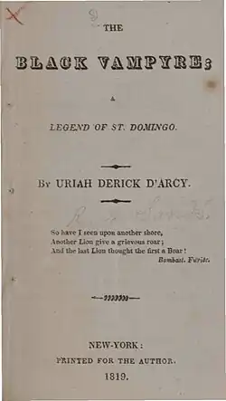 The Black Vampyre; A Legend of St. Domingo is an American short story published in 1819 by the pseudonymous Uriah Derick D'Arcy.[1] It is credited as "the first black vampire story, the first comedic vampire story, the first story to include a mulatto vampire, the first vampire story by an American author, and perhaps the first anti-slavery short story."[1] The Black Vampyre tells the story of a black slave, who is resurrected as a vampire after being killed by his captor; the slave seeks revenge on his captor and achieves it by stealing the captor's son and marrying the captor's wife. D'Arcy sets the story against the conditions that led to the Haitian Revolution.
