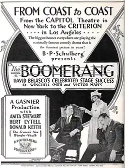 The Boomerang is a 1925 American silent comedy film directed by Louis J. Gasnier and starring Anita Stewart, Bert Lytell, and Ned Sparks.[1] It was based on a Broadway play of the same title by Winchell Smith and Victor Mapes, which was later adapted for the 1929 film The Love Doctor.