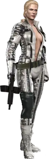 The Boss's likeness was modelled on actress Charlotte Rampling.[2] In the finished game, she wears a pale-colored combat outfit; Kojima originally planned to have her in a blue sneaking suit similar to Solid Snake for the finale of the game, but this idea was ultimately cut.[3] During the shooting of the final scene between The Boss and Naked Snake, Eriko Hirata (The Boss's motion capture actress), having read the script beforehand, was so moved by the scene that she broke down into tears.[4] Hideo Kojima said in 2012, he would "love" to create a new prequel game starring The Boss as the protagonist.[5]