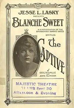 The Captive is an American silent-era film released on April 22, 1915. It was released on five reels.[3] The film was written, directed, edited, and produced by Cecil B. DeMille. Jesse L. Lasky was another producer and Jeanie MacPherson worked with DeMille to write the screenplay. The film is based on a play written by Cecil B. DeMille and Jeanie MacPherson. The Captive grossed over $56,000[4] on a budget of $12,154.[5] Blanche Sweet stars as Sonia Martinovich, alongside House Peters who stars as Mahmud Hassan. The film details the romantic war-era plight of Sonia and her lover Mahmud.