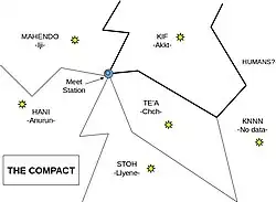 Knnn, the third methane-breathing species, multi-legged tangles of wiry black hair, are the most technologically advanced in the Compact. Unlike other known species, they can maneuver in hyperspace and carry other ships with them. Only tc'a can communicate with them (or claim they can); the knnn are incomprehensible and therefore deemed dangerous by the other species, not to be provoked. They trade by taking whatever they want and leaving whatever they deem sufficient as payment behind; it is an improvement over their prior habit of just taking trader ships apart.