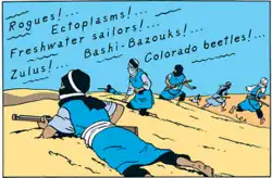 Stranded at sea, a seaplane tries to attack them; Tintin and the Captain hijack the plane, tie up the pilots, and try to reach Spain. Haddock's drunken behaviour in a storm causes them to crash-land in the Sahara desert instead, where the pilots escape.[1] After trekking across the desert and nearly dying of dehydration, Tintin and Haddock are rescued and taken to a French outpost, where they hear on the radio that the storm has sunk the Karaboudjan. They travel to Bagghar, a Moroccan port, and are attacked by Tuareg tribesmen along the way. In Bagghar, the Captain recognises the Karaboudjan disguised as another ship, but he is kidnapped by his former crewmen. Meanwhile, Tintin meets Thomson and Thompson and learn that wealthy merchant Omar Ben Salaad sells the crab tins that are used to smuggle the opium.
