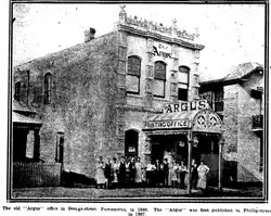 The newspaper was founded by Messrs. Thomas Davies Little, Frederick William James Lovell, Richard Stewart Richardson and Alfred Gazzard, all formerly associated with The Cumberland Mercury newspaper. The paper's office was located in Phillip Street, later George Street, Parramatta, with correspondents located around various districts. Initially issued weekly on Saturdays, costing 2d an issue, a subscription to The Cumberland Argus cost 2 shillings per quarter in 1888.[1][2][3][4][5]